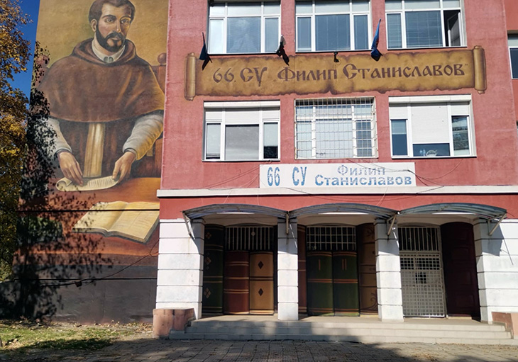 Вторият проект също включва премахване на надписи върху фасадата на 66. СУ “Филип Станиславов”. Ликът на патрона на училището освежи визията на сградата, допълнен от изрисуваните книги около входа.