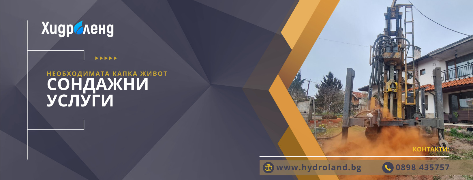 ХИДРОЛЕНД ЕООД предоставя надеждни и висококачествени сондажни услуги и геоложки проучвания. С дълъг опит най-вече в областта сондажи за вода. Компанията е подкрепена с модерно сондажно оборудване, инфраструктура и технологични решения за извличане на подземна вода. Работим главно в градовете и областите - Бургас, Варна, Стара Загора, Сливен, Ямбол, Карнобат, Хасково, Свиленград, Тополовград и околните в съседство на тях градове и села! Услугите, които фирма ХИДРОЛЕНД предлага са: * сондажи за вода - за битови нужди; * дълбоко сондиране - за неограничено водочерпене в промишлеността и земеделието; * сондиране в различен вид почви - от меки глинести земни маси до твърди скали; * сондиране в нестабилни почви - насипи, пясък, чакъл и други склонни към срутване земни формации; * тампониране - ограничаване на горни и замърсени подпочвени води или солени води; * геотермални сондажи, пилотни сондажи, водопонизителни сондажи, пиезометрични сондажи; * геоложко проучване - георадар с автоматичен анализ до 500 м; * узаконяване на сондажи;