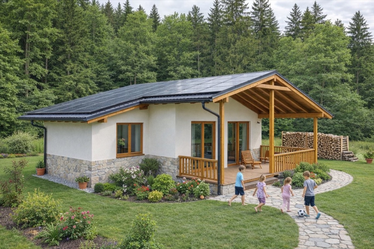 Покритата веранда е сърцето на този дом — място за дълги вечери навън, за книга и чаша вино, за разговори, които не бързат да свършат. А вътре всичко е на една ръка разстояние — без излишни коридори, без загубено пространство.