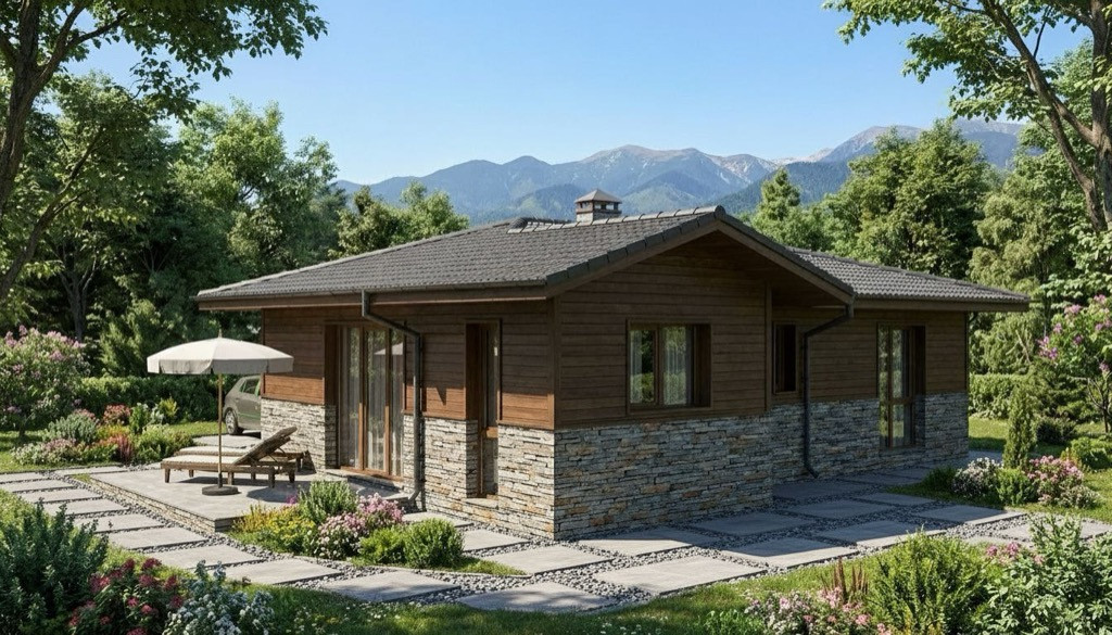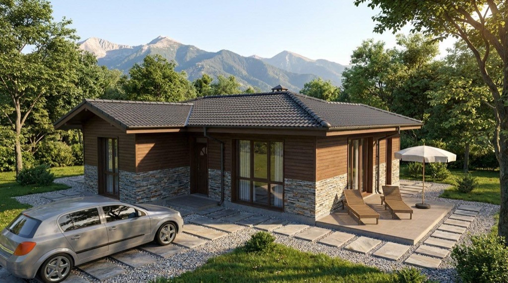 Архитектурен облик: Визията съчетава модерни обеми с естествени материали – натурален гнайс и дървена обшивка, които придават топлина и уют. Динамичният многоскатен покрив с керемиди в цвят антрацит създава запомнящ се силует, подходящ както за планински райони, така и за съвременната градска среда.