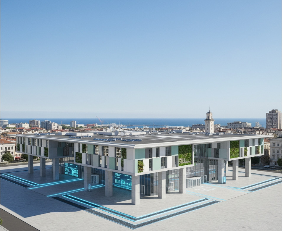 Дата: [4.10.2025] 1. ВЪВЕДЕНИЕ И ОБОСНОВКА Настоящият проект представя концепция и детайлни решения за изграждане на модерна, многофункционална сграда в централна градска зона на Бургас. Сградата е проектирана да служи като устойчиво убежище при широк спектър от природни катаклизми (земетресения, наводнения, ураганни ветрове, торнада) и други извънредни ситуации, осигурявайки безопасност и подслон за гражданите. В нормални условия, тя ще функционира като обществен център, допринасящ за културния и социален живот на града. Основни цели на проекта: ● Осигуряване на сигурно и автономно убежище за голям брой хора при бедствия. ● Интегриране на иновативни технологии за енергийна независимост и ресурсна ефективност. ● Създаване на функционална и естетически издържана сграда, която се вписва хармонично в градската среда на Бургас. ● Изграждане на устойчива инфраструктура, способна да посрещне предизвикателствата на климатичните промени. 2. КОНЦЕПЦИЯ И МНОГОФУНКЦИОНАЛНОСТ Сградата е замислена като "Устойчив градски хъб" – централно място, което комбинира обществени функции с висок капацитет за реагиране при кризи. В нормални условия, сградата може да включва: ● Многофункционални зали за събития, конференции, изложби. ● Коуъркинг пространства или обучителни центрове. ● Търговски зони от първа необходимост, аптека, медицински кабинет. ● Обществени пространства за отдих и взаимодействие. При настъпване на бедствие, сградата ще се трансформира бързо и ефективно в: ● Приемен център: За регистрация и първоначална оценка на нуждаещите се. ● Жилищни зони: Модулни пространства за временно настаняване, със зони за семейства, деца и възрастни хора. ● Медицински център: За оказване на спешна медицинска помощ и поддържане на здравето. ● Център за логистика и разпределение: За храна, вода, медикаменти и други жизненоважни провизии. ● Комуникационен център: За връзка с външния свят и координация на спасителни дейности. 3. ОСНОВНИ АРХИТЕКТУРНИ И ИНЖЕНЕРНИ РЕШЕНИЯ 3.1. Архитектурен вид и градоустройствена интеграция ● Модерен, изчистен дизайн: Сградата е проектирана със съвременна естетика, висока функционалност и масивна конструкция, издигната наравно с терена, без заобикалящи склонове. ● Материали: Ще се използват издръжливи, екологични и енергоефективни материали като високоякостен стоманобетон, стъклопакети с нискоемисионни покрития, метални композитни панели и естествени материали за "зелени" елементи. ● "Зелени стени" и покрив: Интегрирани вертикални градини и озеленен покрив допринасят за градската екология, естетиката, енергийната ефективност и управлението на дъждовната вода. ● Осветеност: Оптимално използване на естествената светлина чрез широкоформатни прозорци, които са проектирани да издържат на екстремни натоварвания и могат да бъдат бързо обезопасени. 3.2. Конструкция и устойчивост на бедствия ● Фундаменти: Дълбоки и масивни фундаменти, проектирани според най-високите сеизмични норми за региона, осигуряващи стабилност при земетресения. ● Монолитна стоманобетонна конструкция: Цялата конструкция е монолитна, изпълнена от високоякостен стоманобетон, което гарантира изключителна здравина и издръжливост на динамични натоварвания. ● Покрив, устойчив на урагани и торнада: ○ Масивна стоманобетонна плоча: Покривът е те