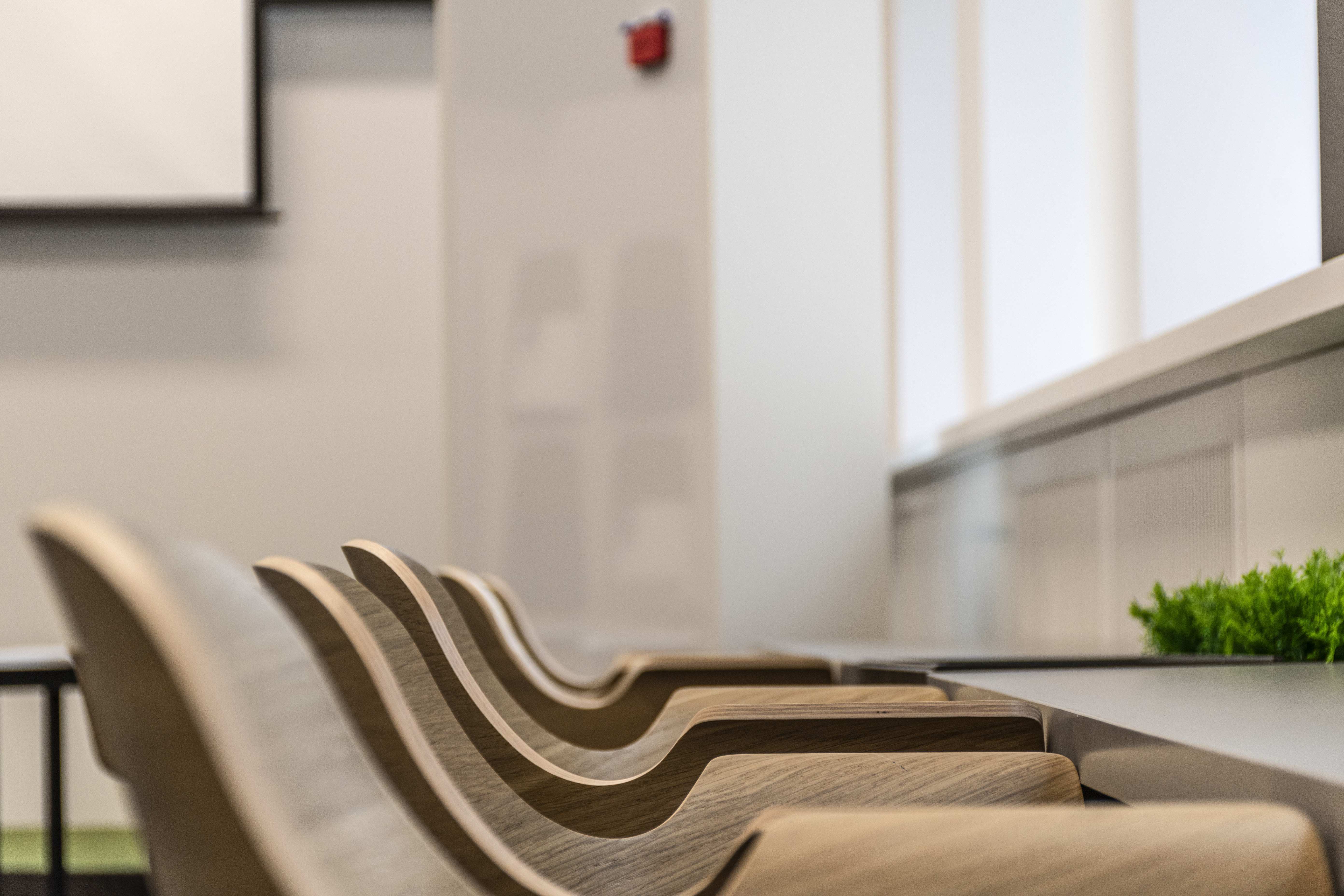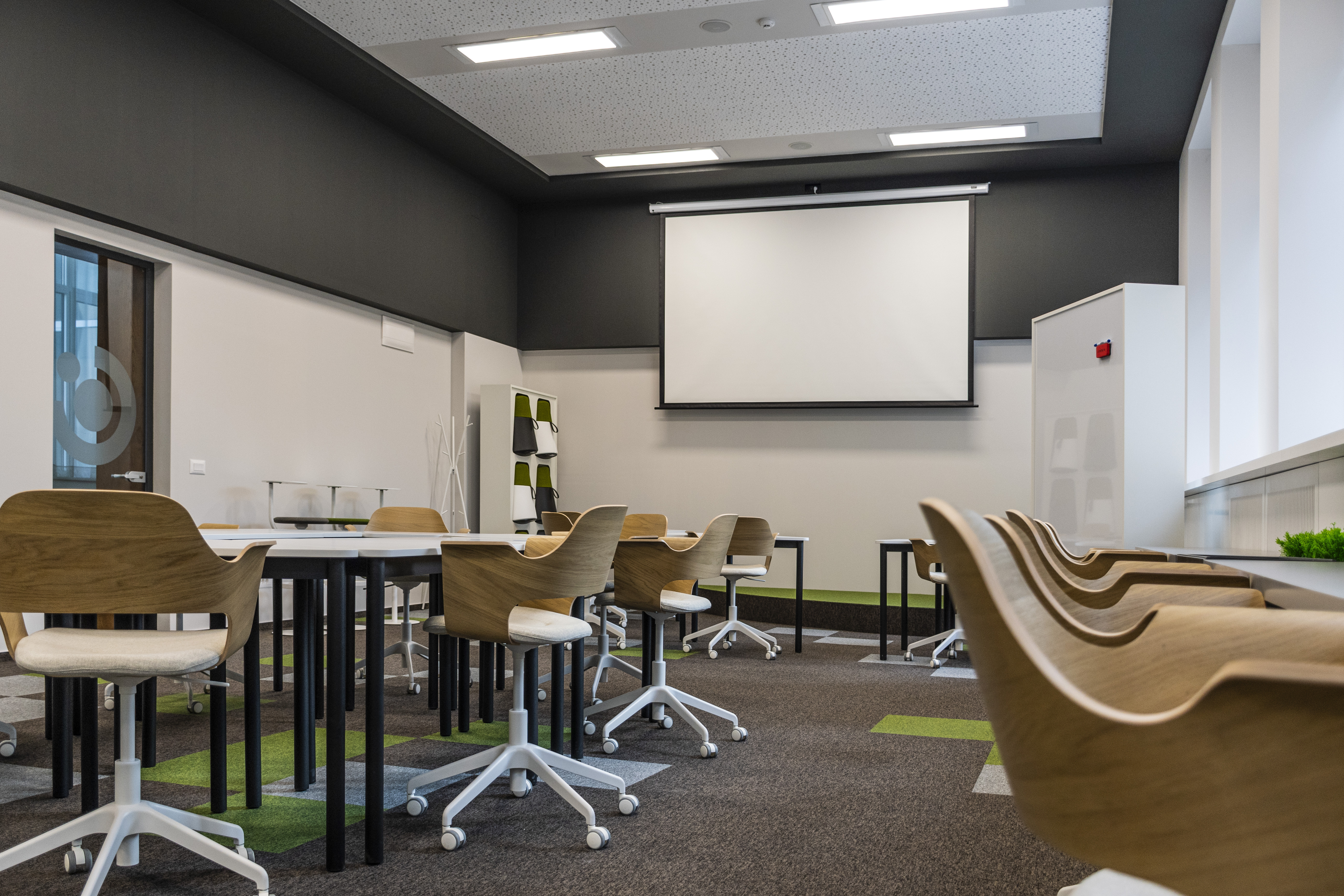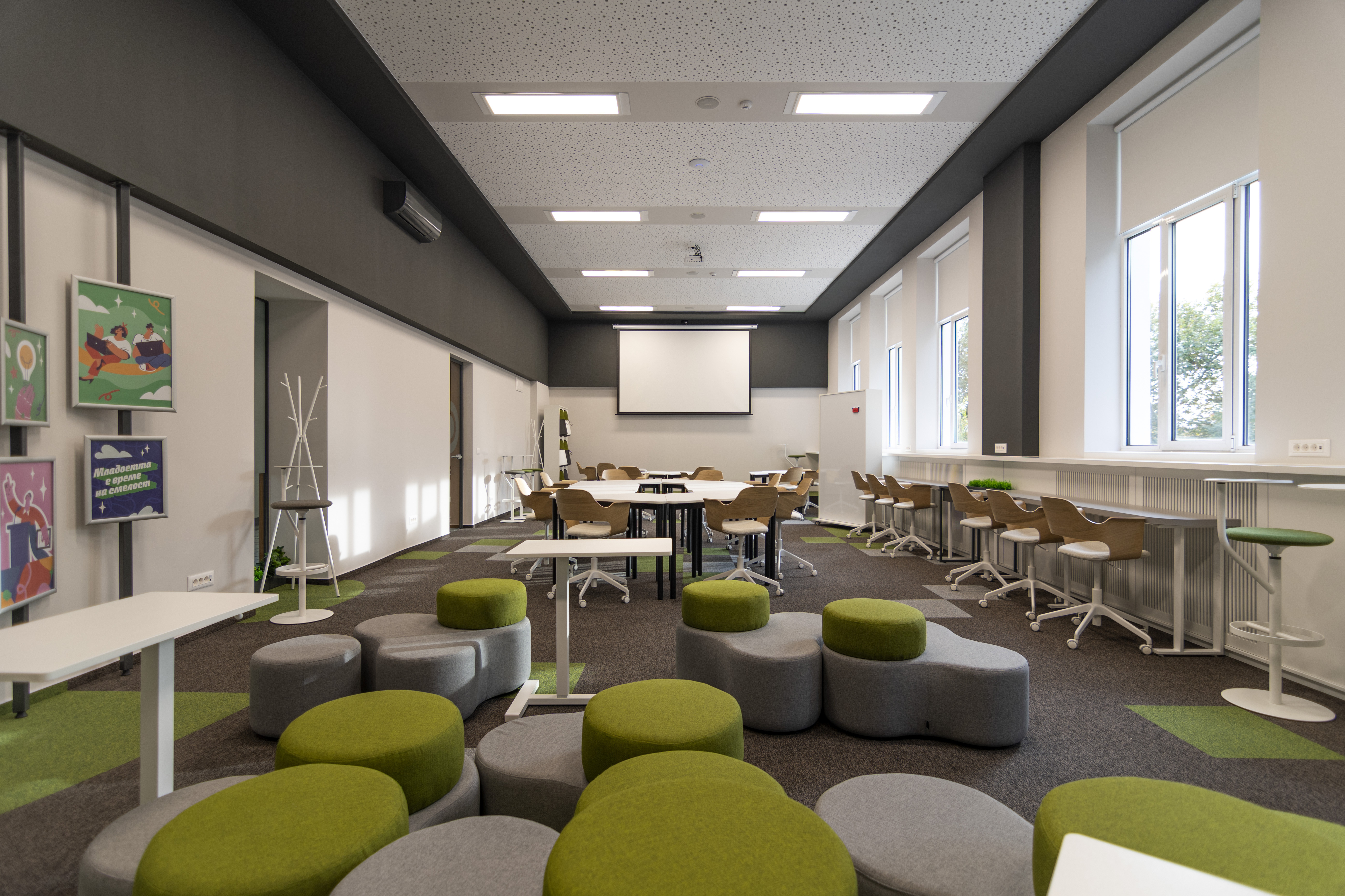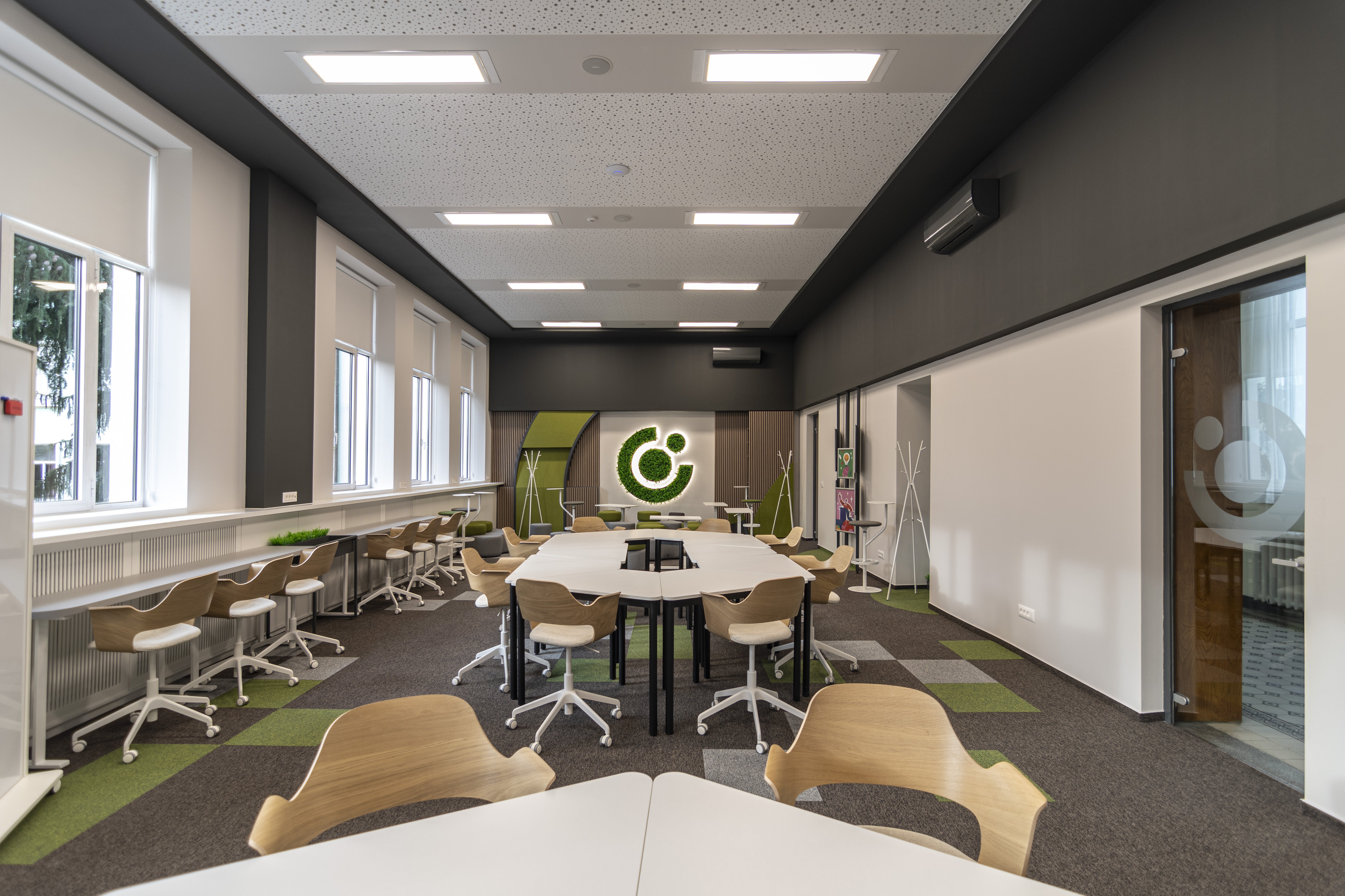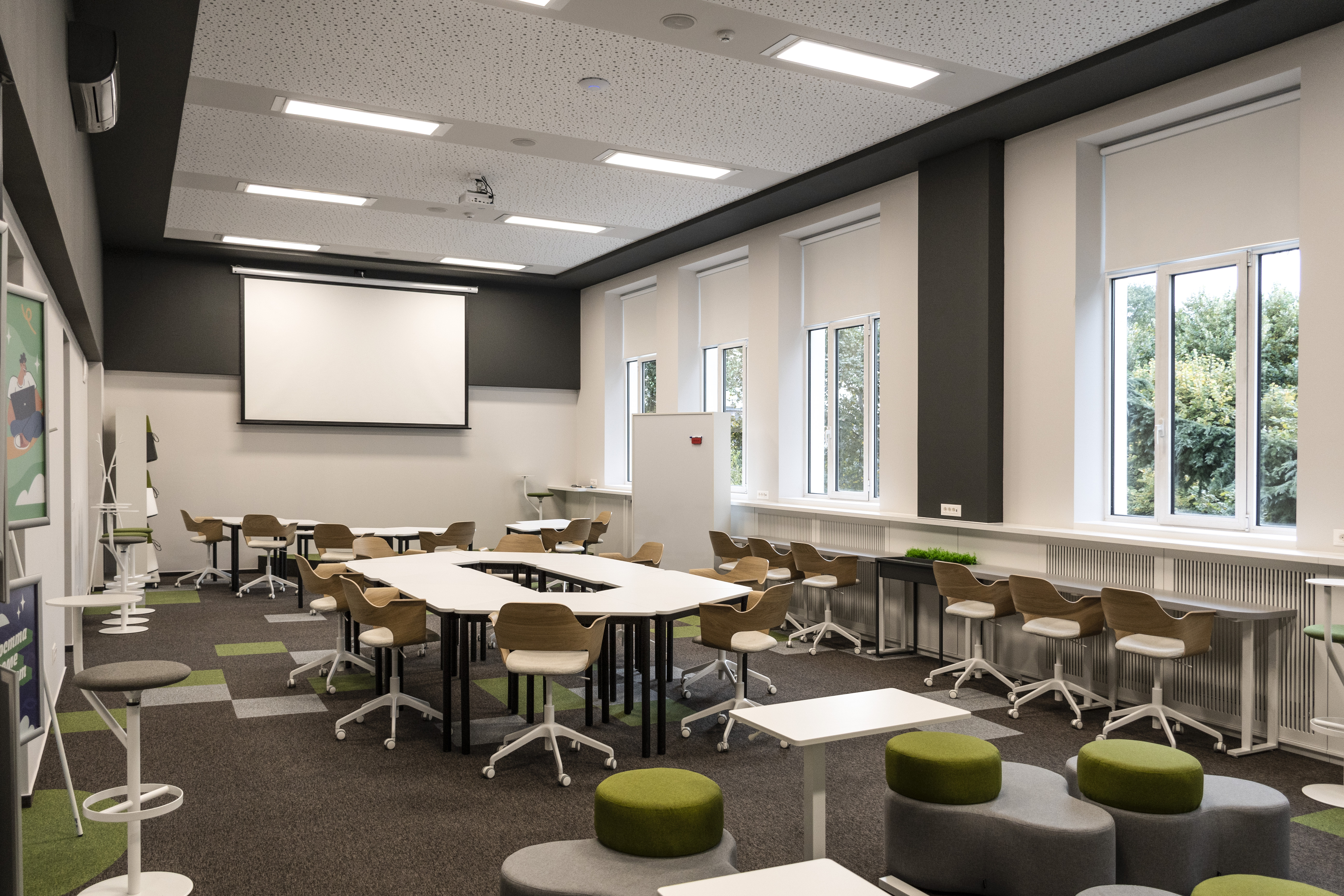 Зала „Моментум“ - новооткрито споделено мултифункционално пространство в Икономически Университет – Варна, проектирано от нашият екип и изградено със съдействието на Банка ДСК.