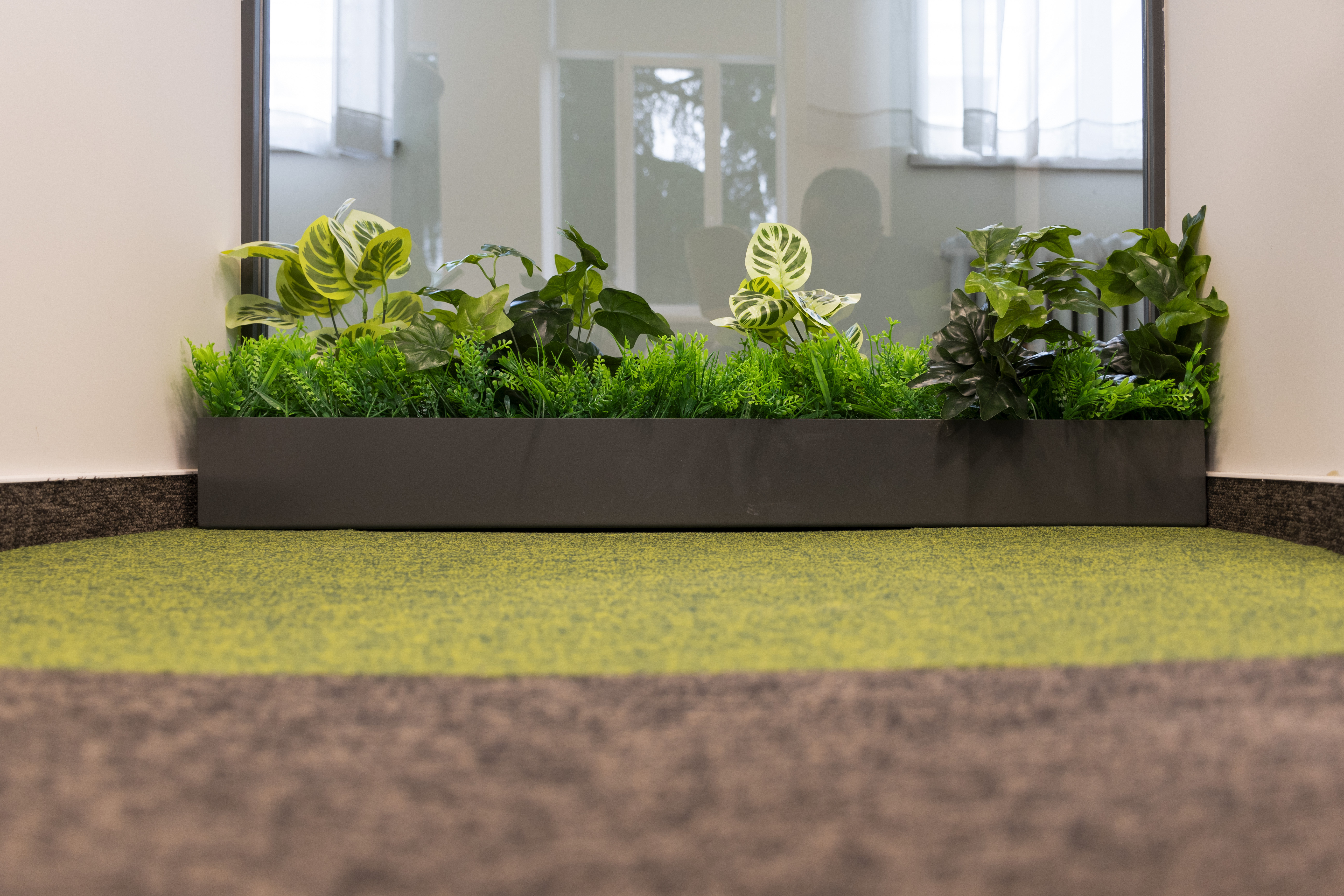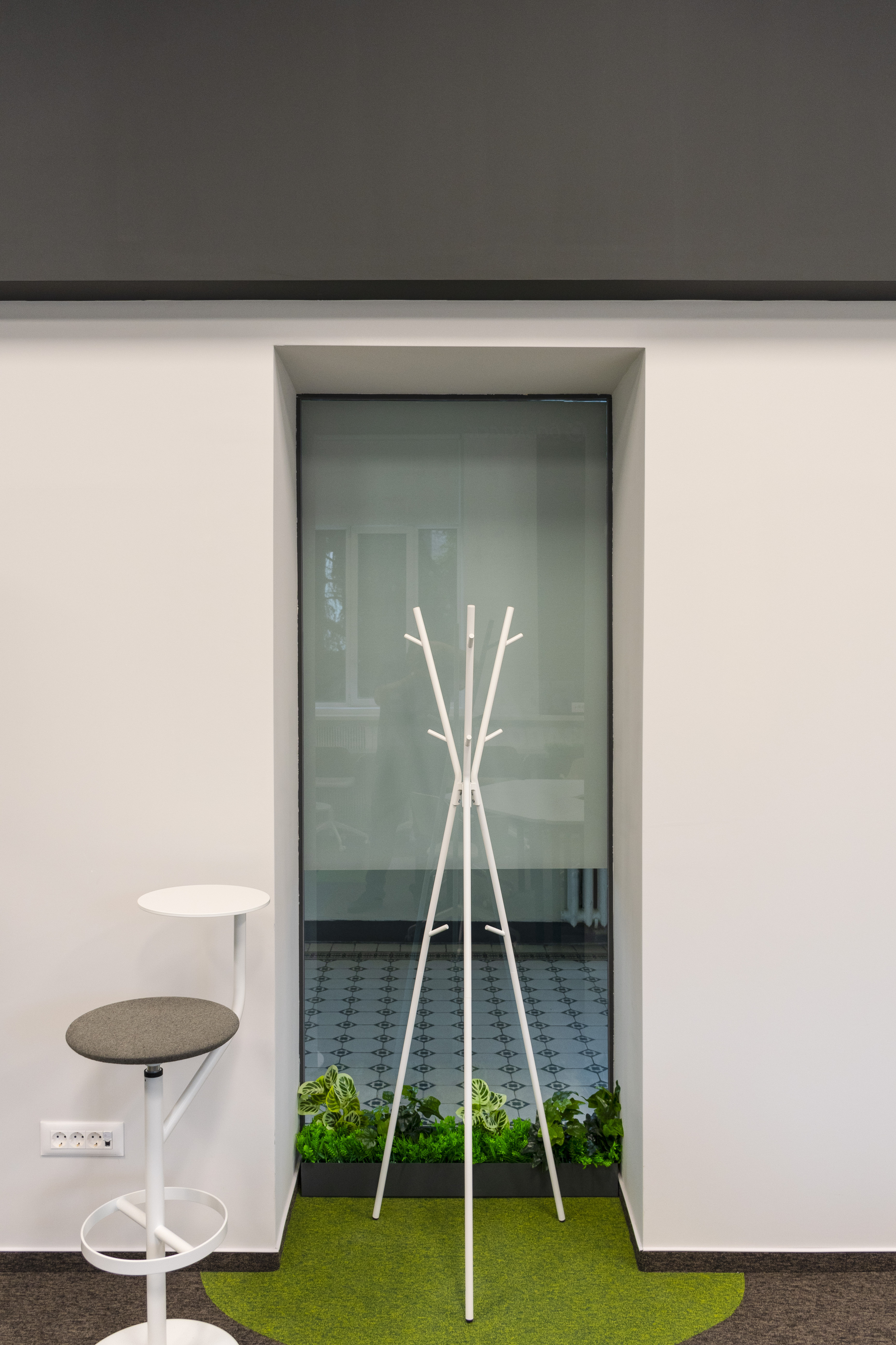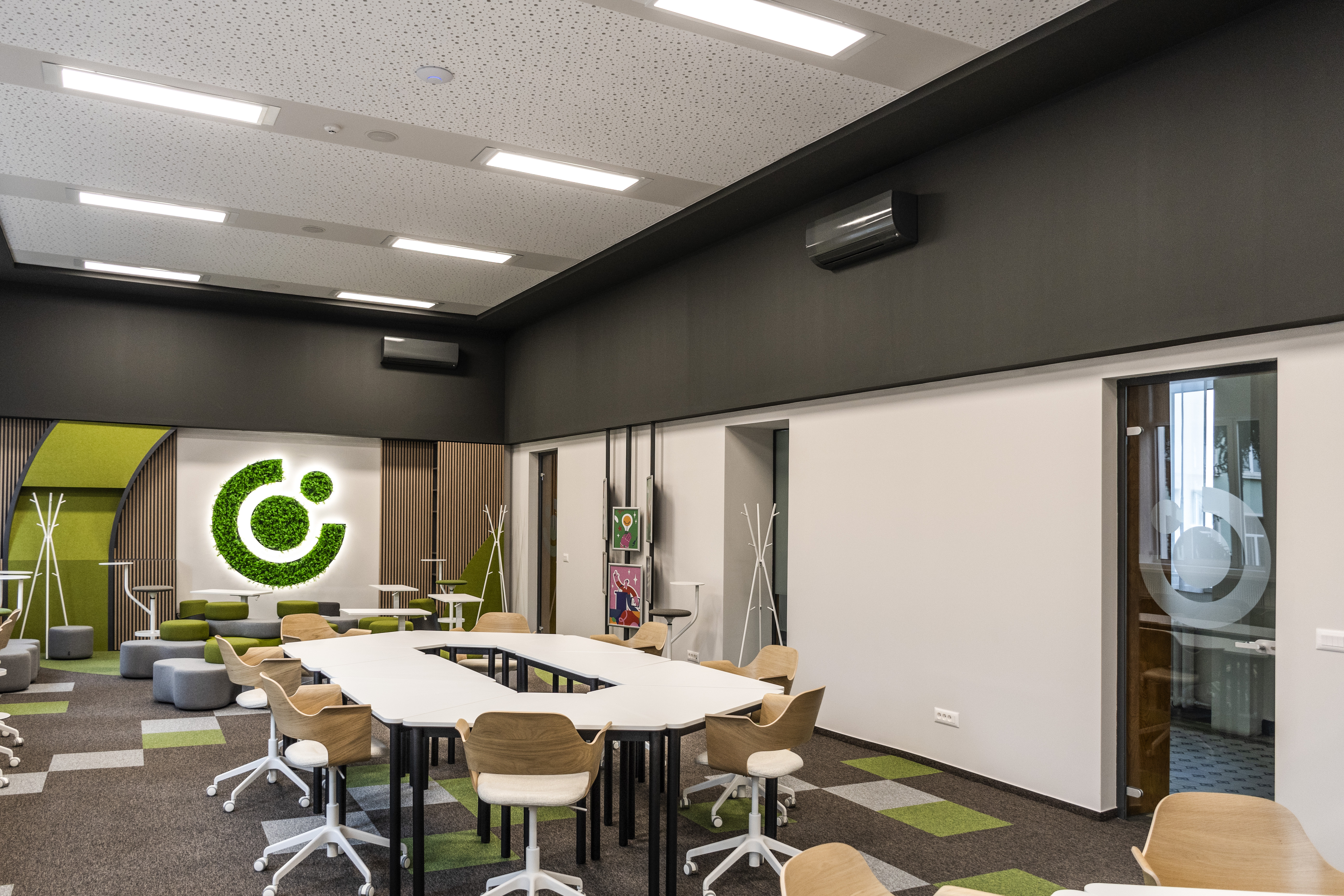 Гъвкавото разпределение и разнообразни мебели позволяват ежедневна трансформация на средата. Предвидени са различни функционални зони за екипна и индивидуална работа, места за отдих и дискусии, както и възможност за презентиране и реклама. Монохромна палитра със зелени акценти, основни за идентичността на Банка ДСК, съчетани с дървени елементи и свободните форми на мебелите TAPA от NowyStyl, и иновативното еко-съобразно решение на Sokoa-Kulbu, пренасят част от природата в интериора. Акустиката е решена с акустичен окачен таван и мокетни плочи. Предвидени са достатъчно места за съхранение и лесен достъп към ревизия на скритите под прозоречният плот радиатори.