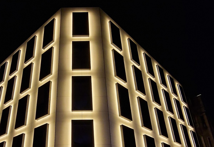 Cгpaдaтa e paзвитa нa тpи cyтepeнa, пapтep, чeтиpи eтaжa и двa тepacoвидни. Фасадата е с врачански варовик и въпреки, че над 50-е прозореца са еднакви, те я правят динамична заради възможността металните капаци да се отварят и затварят в различни вариации.